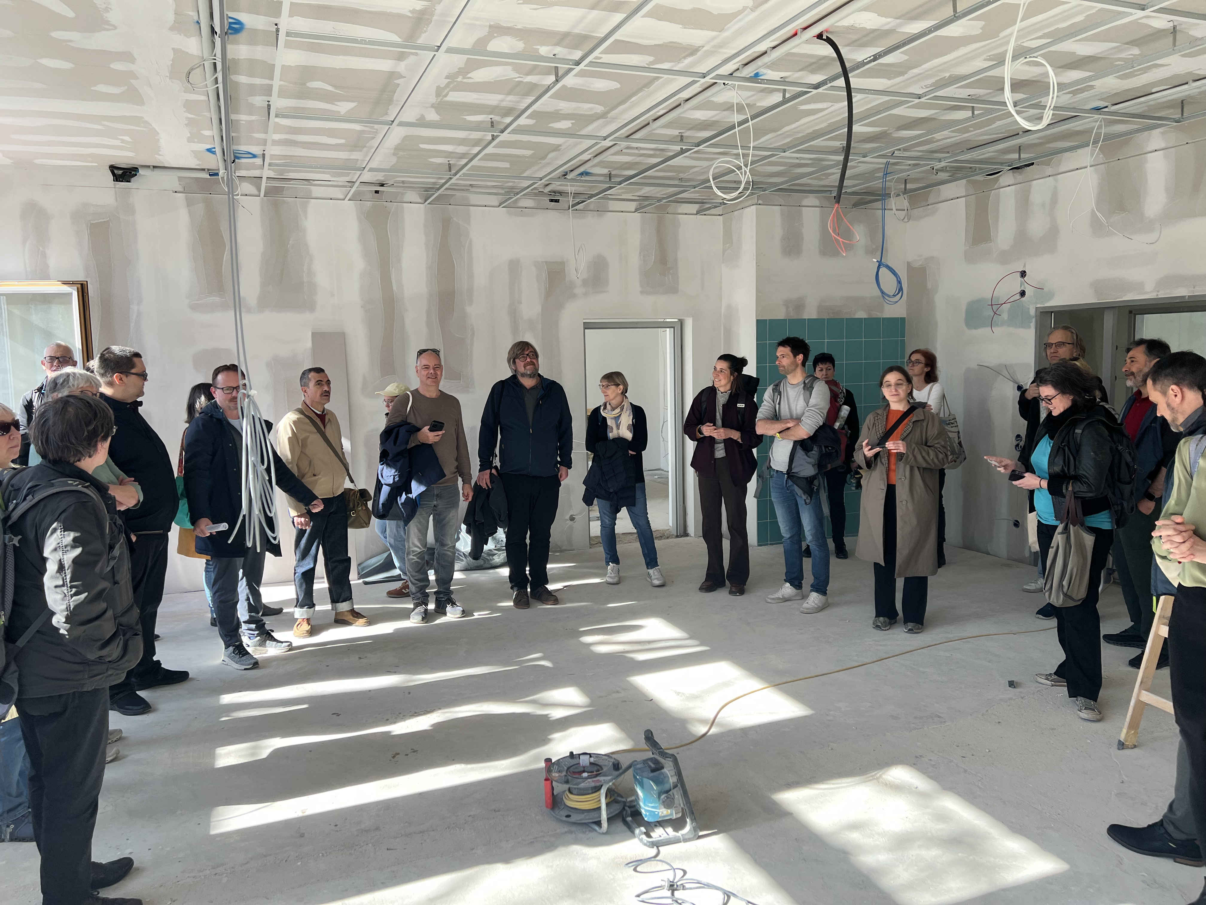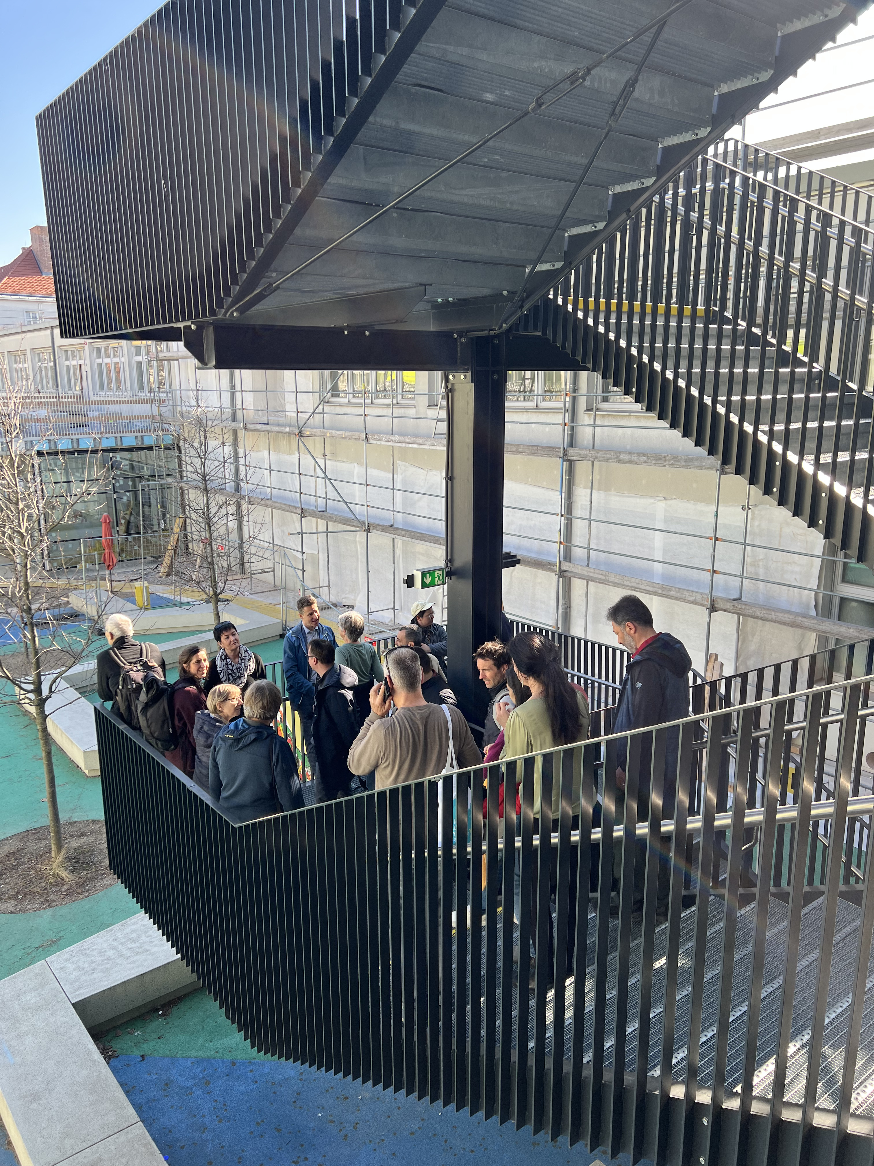 During the site visit, the partners gave a tour of the Enkplatz Secondary School. The school has been expanded with a new building phase. What makes it special is that the four sports halls have been built beneath the sports field, dug into the ground. In addition, the two school wings are being modernised to improve energy efficiency – whilst complying with heritage conservation requirements. A PV system is installed on the roof of the school building. Modern classrooms and a canteen have been created as part of the modernisation.